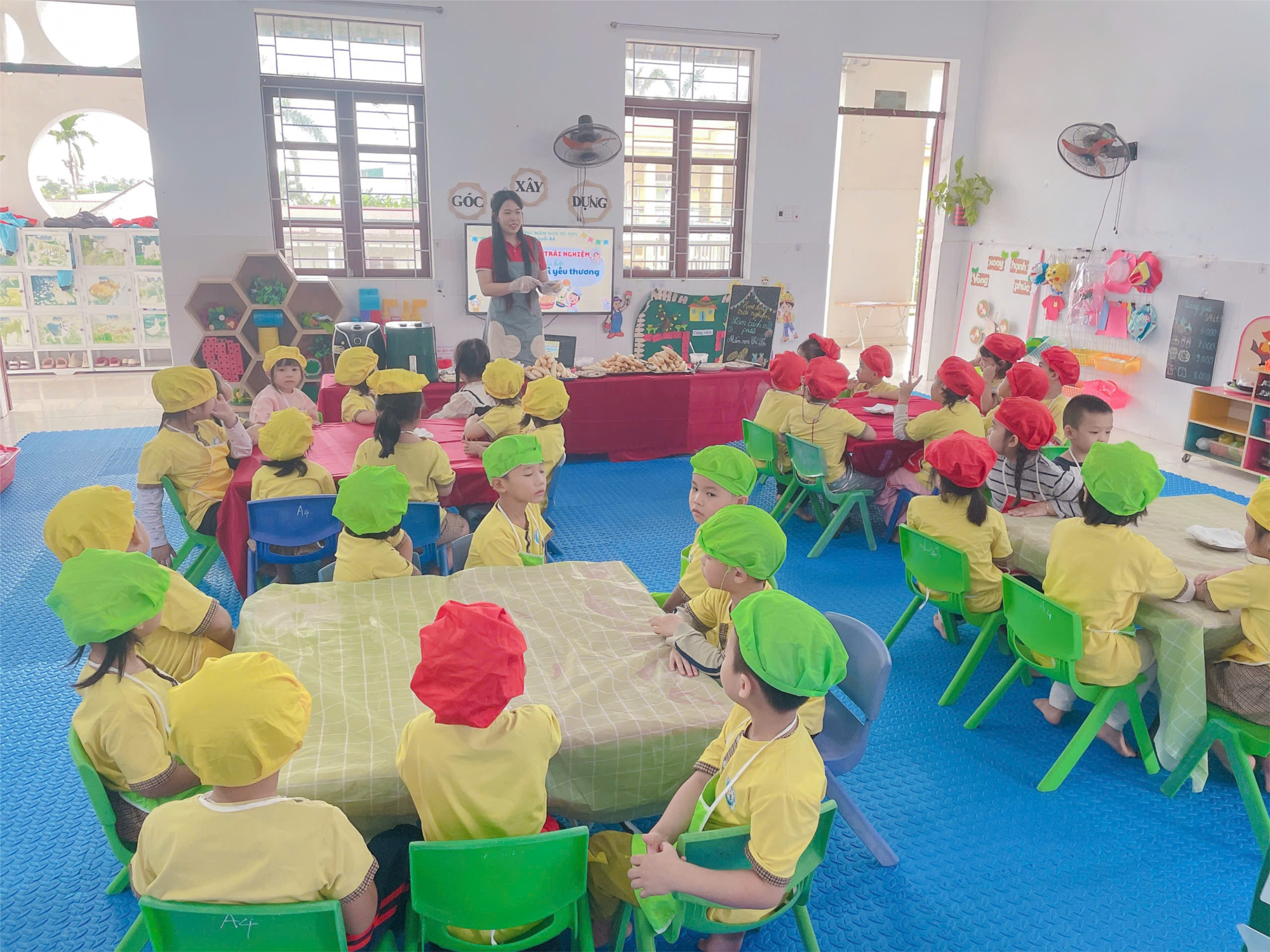 Trước khi thực hiện, các con rất chăm chú nghe cô giáo giới thiệu nguyên liệu và hướng dẫn